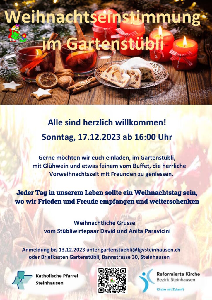 Feiern im Gartenstübli Weihnachtseinstimmung Anmeldung Am Sonntag 17. Dezember 2023 stimmen wir uns im Gartenstübli auf Weihnachten ein. Wir laden Euch ein, draussen und im Stübli, mit Glühwein und etwas Feinem vom Buffet, die herrliche Vorweihnachtszeit mit Freunden zu geniessen. Mehr Informationen findet Ihr hier. Meldet Euch bitte bis 13. Dezember 2023 unter gartenstuebli@fgvsteinhausen.ch oder per […]