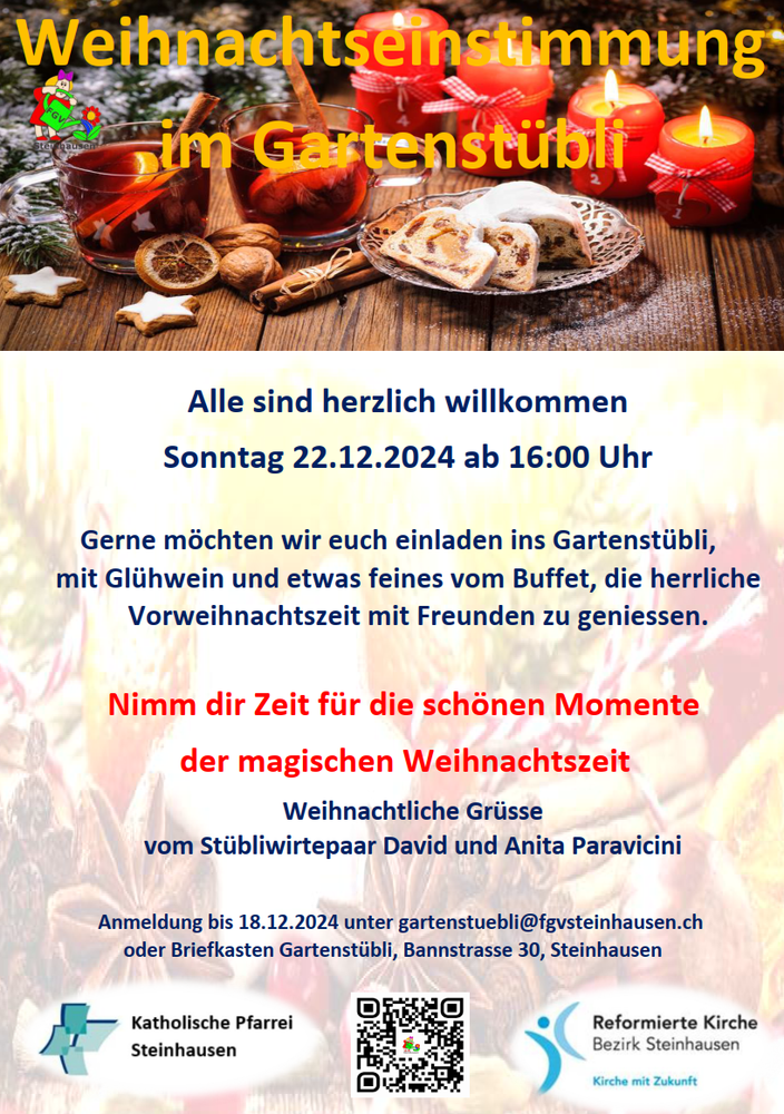 Feiern im Gartenstübli Weihnachtseinstimmung Anmeldung Am Sonntag 22. Dezember 2024 stimmen wir uns im Gartenstübli auf Weihnachten ein. Wir laden Euch ein, draussen und im Stübli, mit Glühwein und etwas Feinem vom Buffet, die herrliche Vorweihnachtszeit mit Freunden zu geniessen. Mehr Informationen findet Ihr hier. Meldet Euch bitte bis 18. Dezember 2024 unter gartenstuebli@fgvsteinhausen.ch oder per […]