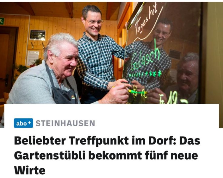 werbung für unser gartenstübli Die Zuger Zeitung berichtet über unsere neuen Wirte Das unsere neuen Wirte gut ankommen, hat sich schnell rumgesprochen.Dies hat sogar die Zuger Zeitung dazu bewogen, ein Interview mit Peter und Roland zu führen. Aber lest selbst: Hier geht es zum pdf Und hier geht es zum Artikel in der Zuger Zeitung. […]