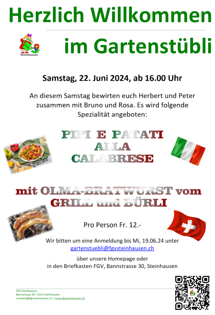 Kulinarik im Gartenstübli Wirtenachmittag mit Herbert, Peter, Rosa und Bruno Im letzten Jahr durften wir uns bereits über die Köstlichkeiten von Herbert, Peter, Bruno und Rosa im Gartenstübli freuen. Nun ist es dieses Jahr am 22. Juni 2024 wieder soweit, dass wir mit Pipi e Patati alla Calabrese und OLMA-Bratwurst vom Grill verwöhnt werden. Bitte […]