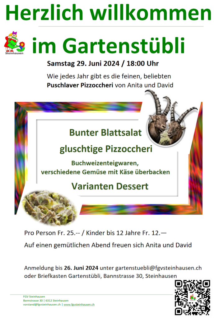 Kulinarik im Gartenstübli Pizzoccheri mit Anita und David Am 29. Juni 2024 gibt es Pizzoccheri im Gartenstübli. Anita und David verwöhnen uns mit diesem Leckerbissen. Bitte meldet Euch bis 26. Juni 2024 unter gartenstuebli@fgvsteinhausen.ch, dem Formular (Button weiter unten) oder per Post im Briefkasten Gartenstübli, Bannstrasse 30, Steinhausen an. Auf einen gemütlichen Abend freuen sich […]