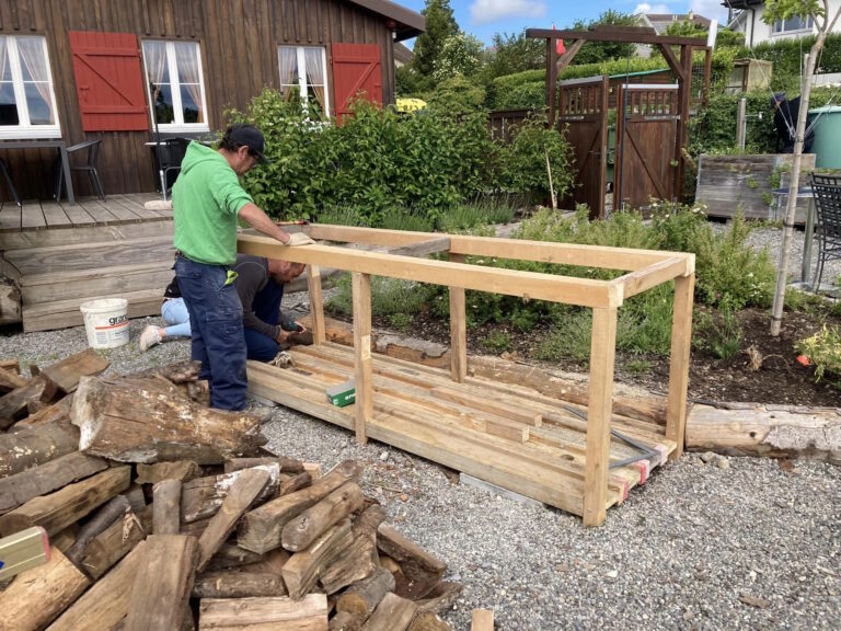 Neben Jäten und Hecken schneiden, Rasenmähen sowie der Pflege unserer Blumenwiesen, wurde auch die zweite Hälfte der Veranda neu gestrichen sowie eine Holzlege gebaut, welche auch als Ablage für den Arealgrill dienen wird.